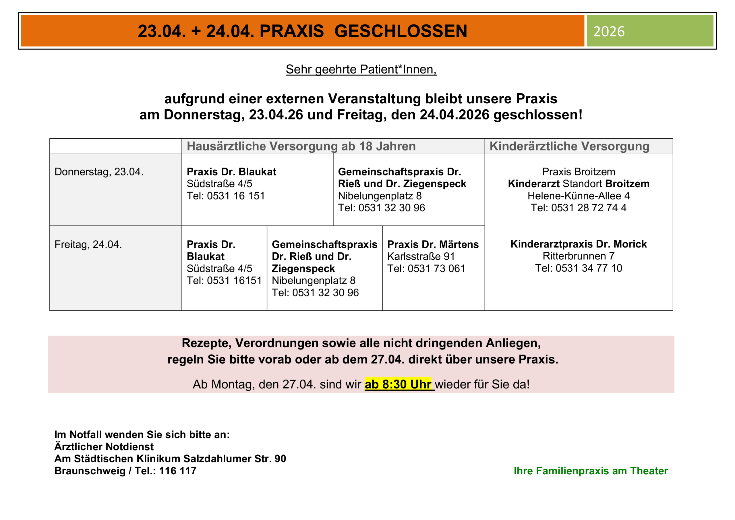 Praxis geschlossen am 23.04 + 24.04.2026